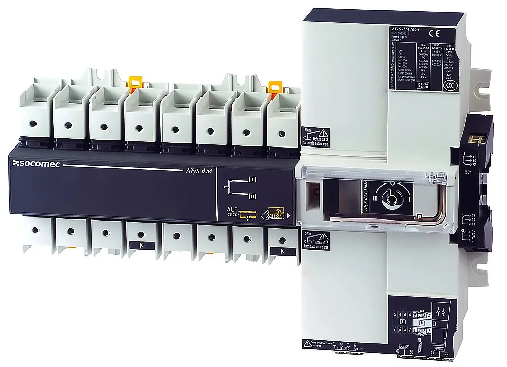 The ATyS line by Socomec is motor-operated switches with electrical and mechanical blocking up to 3200 A. Electrical commands are operated with a motor-operated unit, which is controlled by two types of flow charts: