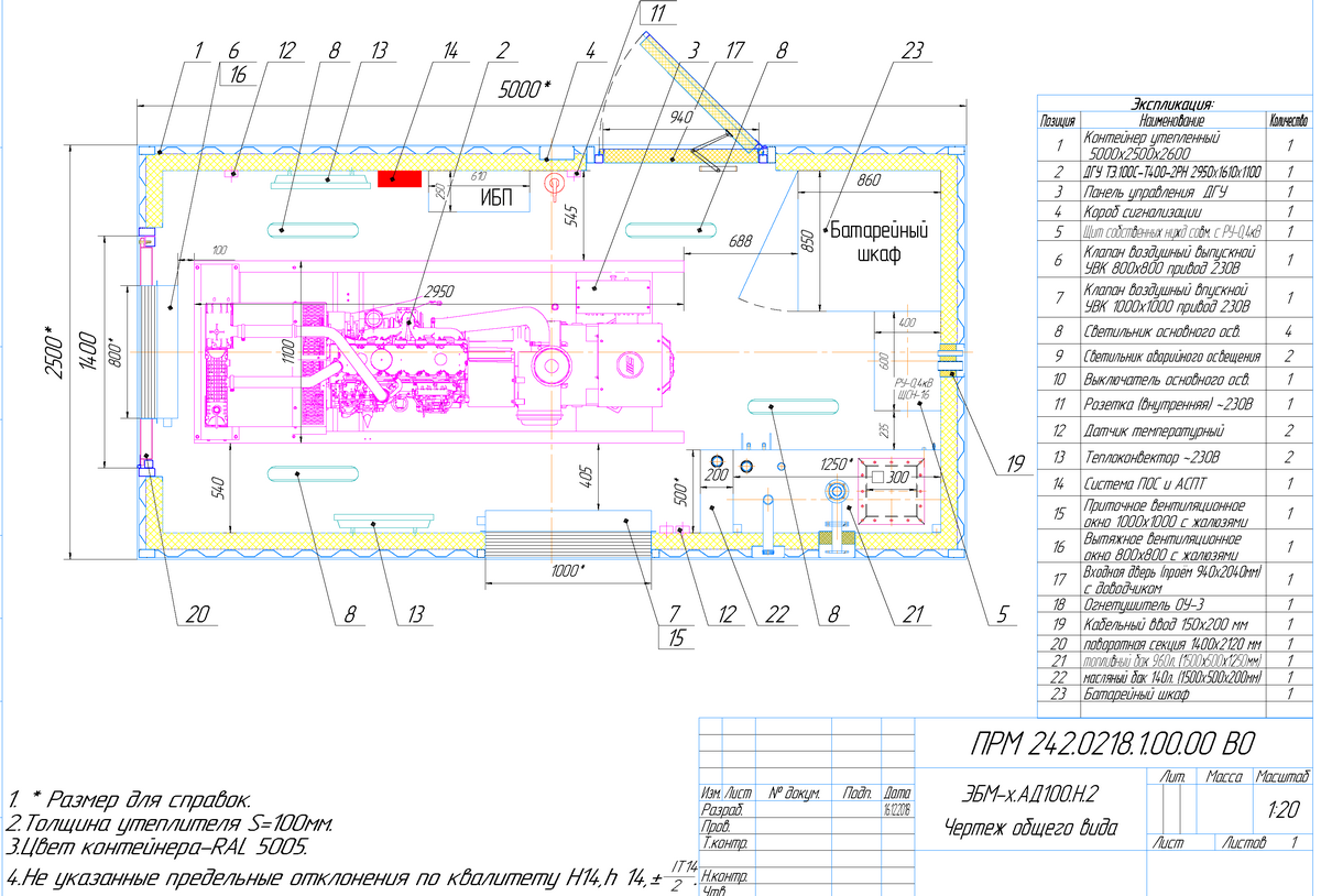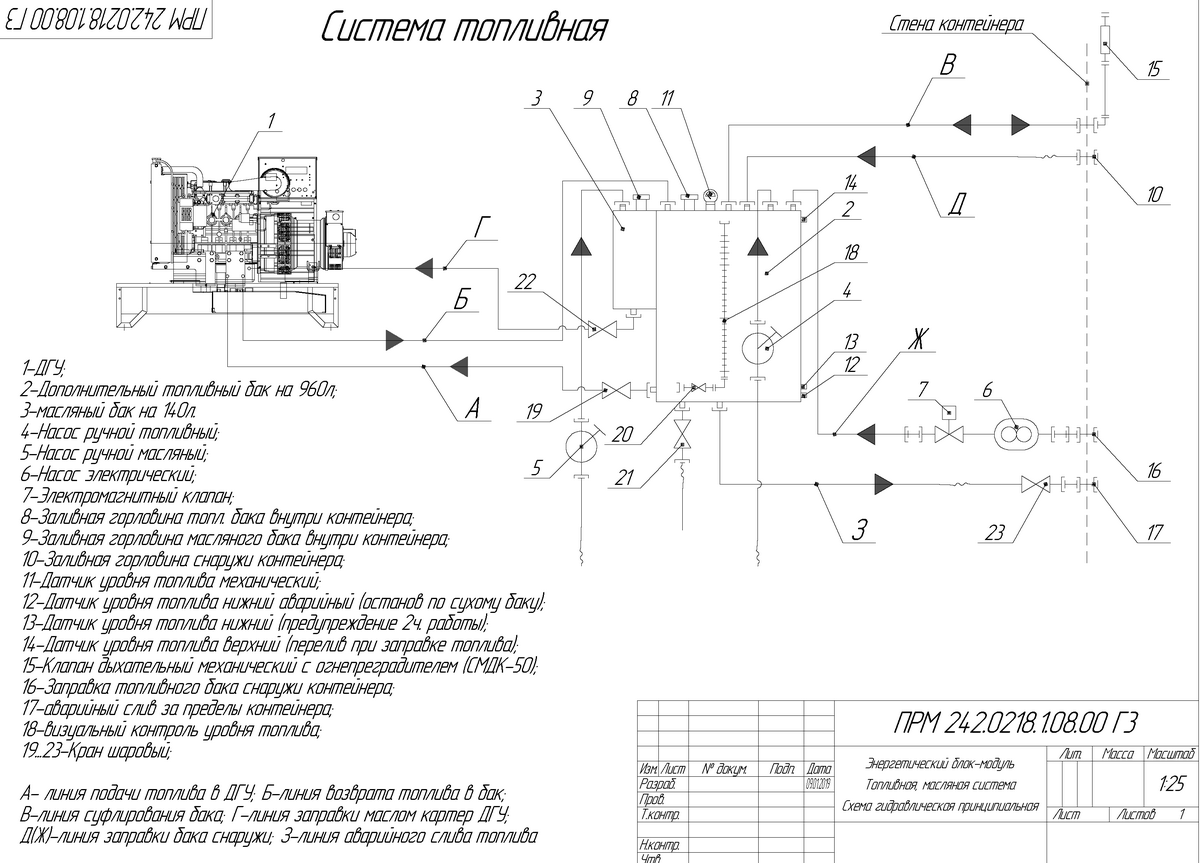 Specification for manufacturing a diesel genset in an all-metal container TE.1400S-T6300-2RN, 1384 kW power, 6,3 kV voltage, 2nd degree of automation: diesel genset technical statement, equipment configuration, fuel supply system, fire safety, security system.