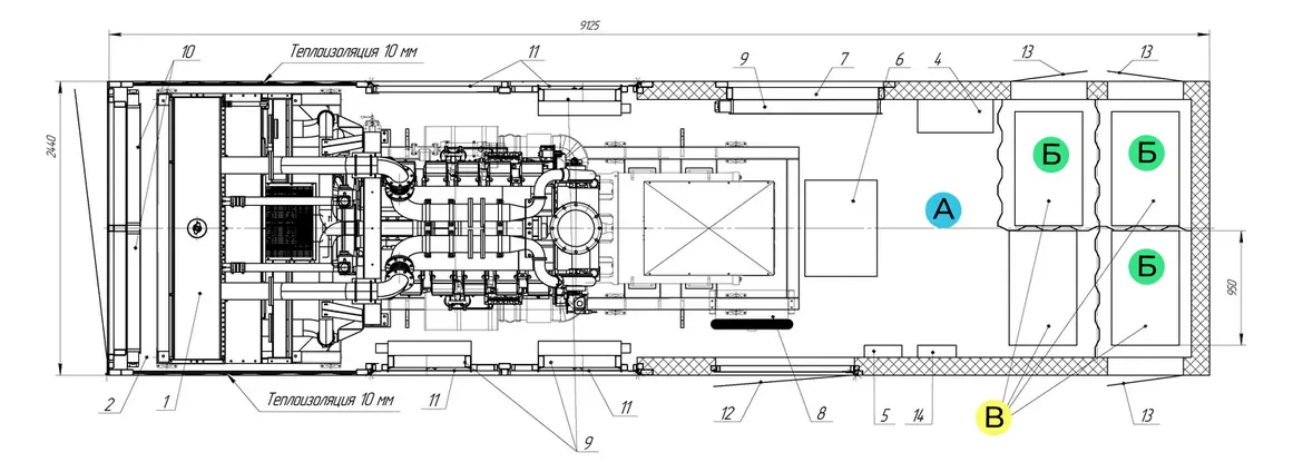 The diesel genset receives fuel from the main tank of the DG (1000 l) and four additional fuel tanks 990 l each, which are installed inside the container. One is in the assembly compartment, the rest three - in separate compartments of the container. Replenishment of the main tank of the genset is carried out automatically through the fuel priming system from the intake pipeline. The fuel-supply line connects the main tank of the genset and four additional ones. The DG automation system ensures: