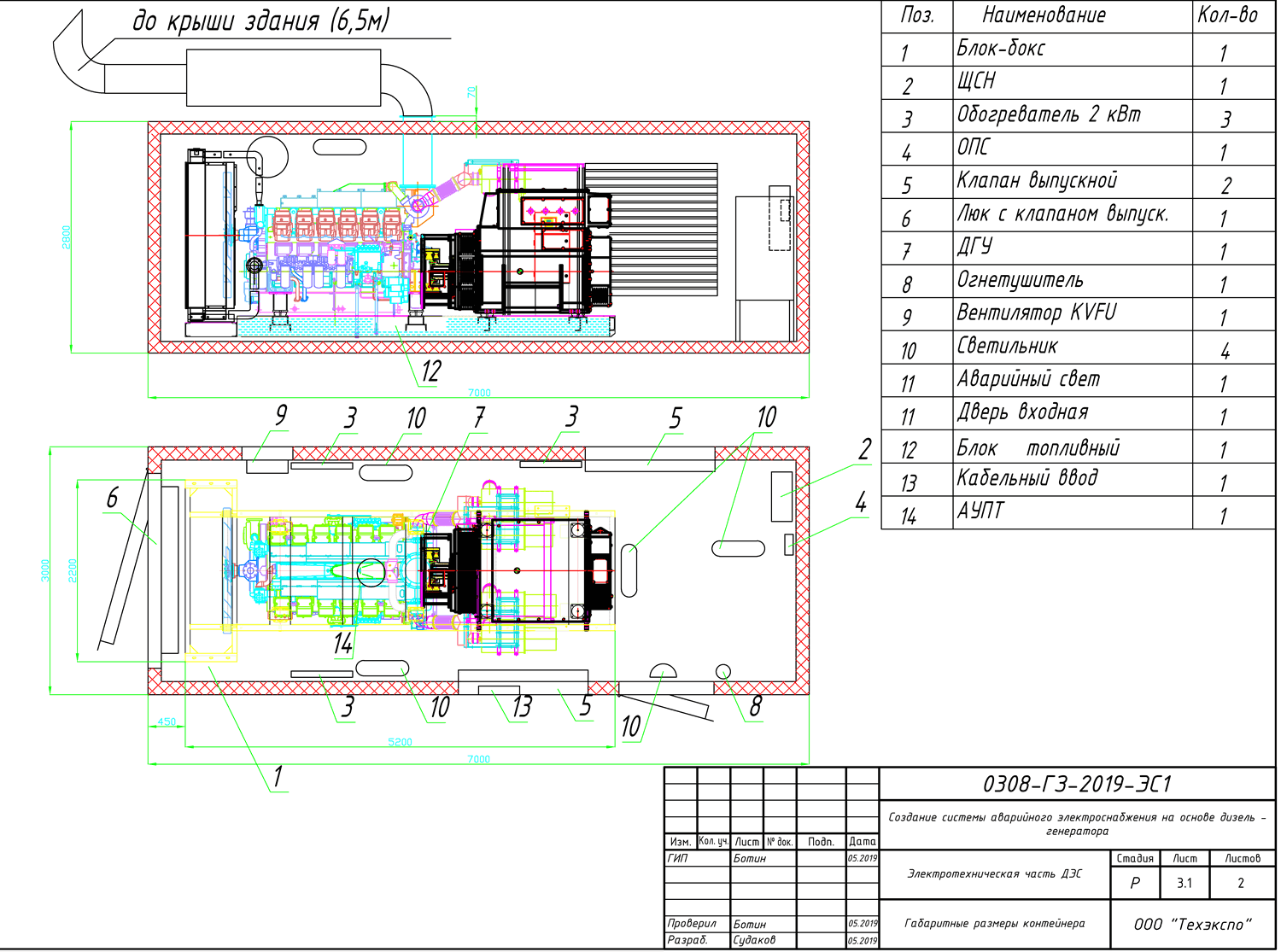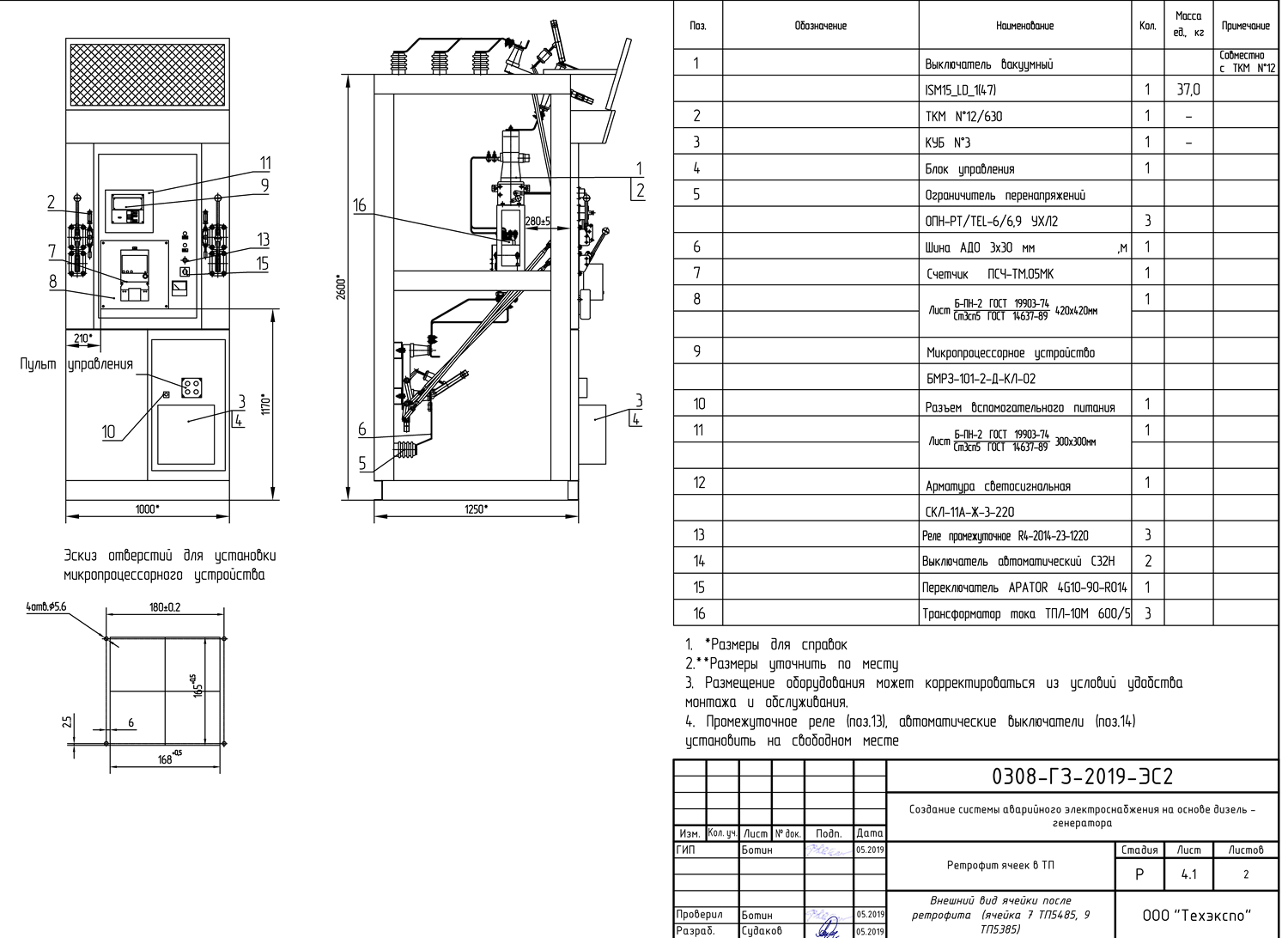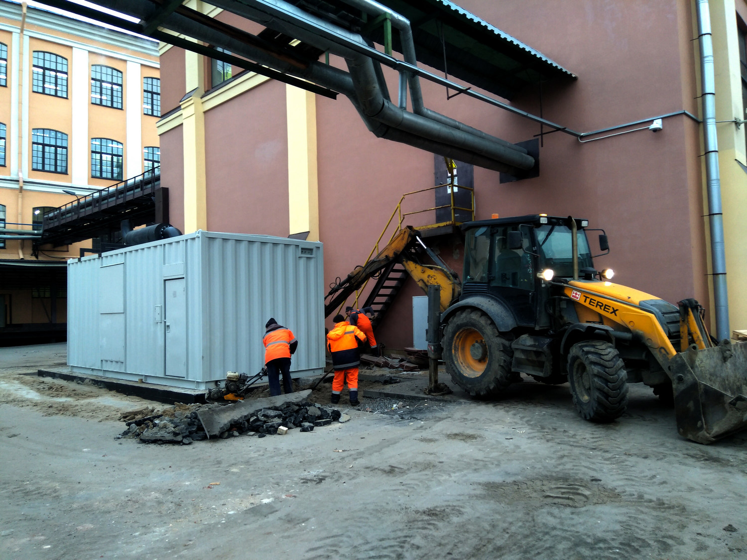 The project provides for fixed load redundancy at the high-voltage side of three transformer substations. To this end, the reconstruction of two of three transformer substations is required – modernization (retrofit) of switching high-voltage cells. In this case, it means the introduction of modern equipment with overcurrent and cutoff functions into existing bodies of HV cells KSO-272 and KSO-292 (switchgear of unilateral maintenance): SM15_LD_1(48) vacuum circuit-breaker, CM-16-1 control unit, BMRZ-152-2-D-VV-01 (relay protection microprocessor unit) safety and automation device. Choosing high-voltage equipment for the project allowed significantly cutting expenses for cables: at a length of 3000 m, savings amounted to 4000 rubles per 1 running meter. The use of a common 400 V diesel genset would require a heavy section and long copper cable, which would additionally increase expenses by 12-15 million rubles only for cables. Based on a topographic plan, we designed laying 6 kV cable lines in the ground and over cable structures inside and outside the building. Brand and section were determined based on the calculation of 6 kV cable line performance, overload factor and 1000 kW diesel genset nominal rating. Estimate documentation – a final stage of the project. An estimate was made for earthwork and construction operations for pre-cabling and cable line installation, assembly operations, site improvement, installation of a diesel genset on a container and foundation construction, an estimate for power equipment, cell retrofit installation works and pre-commissioning activities. Project implementationEquipmentA 1 MW diesel genset with a Mitsubishi S12R-PTA engine and a Leroy Somer LSA52.2L45 current generator with a voltage of 6,3 kV. A 1000-liter fuel tank. The diesel genset is housed in a Techexpo own-produced heat-insulated all-metal container. The container comes with a fire alarm and fire suppression system, a heating system, lighting and ventilation systems. The diesel genset auxiliaries board is also placed in the container and provides all container systems with power. The diesel genset operation is monitored using a Сomap AMF25 controller. The gas exhaust system consists of a muffler, a discharge and a flexible compensator provided by the diesel genset manufacturer, and a metal rain-proof discharge. Earthwork and construction operations:Before diesel genset installation, we laid cable lines and prepared the foundation. According to clauses 1.5, 1.6, 2.5 of Building codes and regulations 2.02.05-87. 'Foundations of machines with live load' the diesel genset foundation was separated from the existing building foundation. Also, its design provides vibration insulation and a reinforced concrete layer. 3 000 meters of cable lines were laid. Laying cable lines was carried out in the ground and over cable structures inside and outside the building. The works were executed according to Instruction #2-02 for Laying Power Cables to 35 kV approved by the Saint Petersburg Cable network, 1991. Trenches for cable lines were provided:
