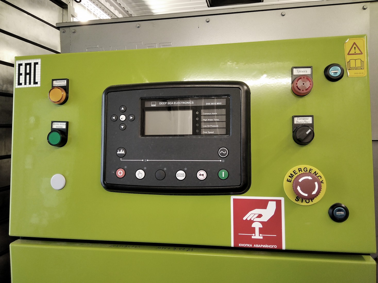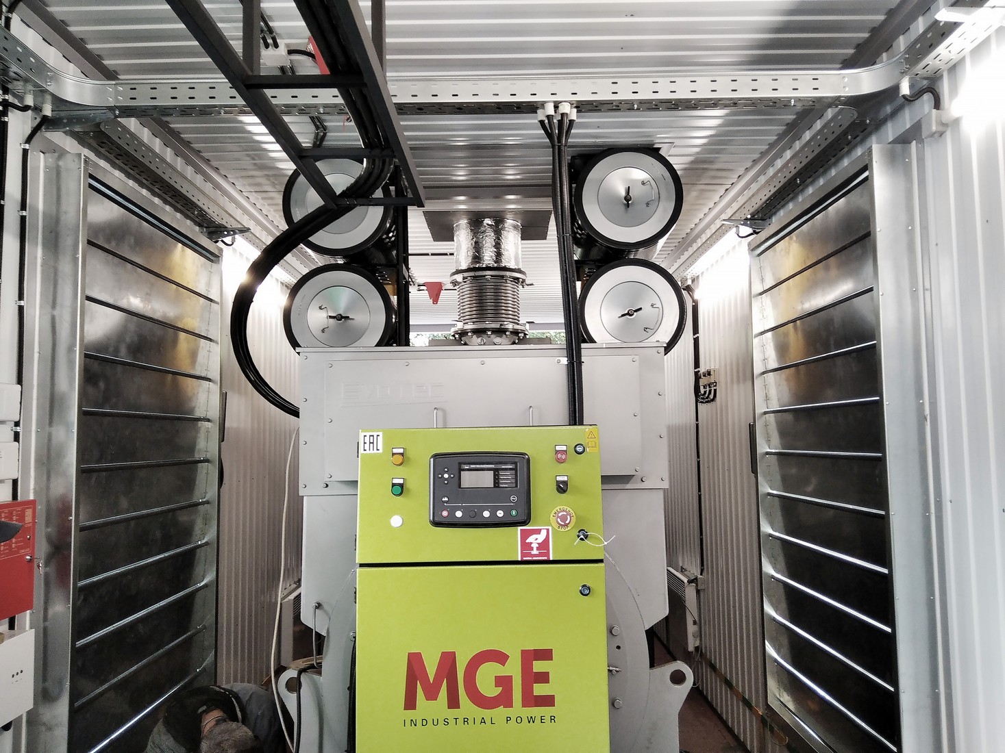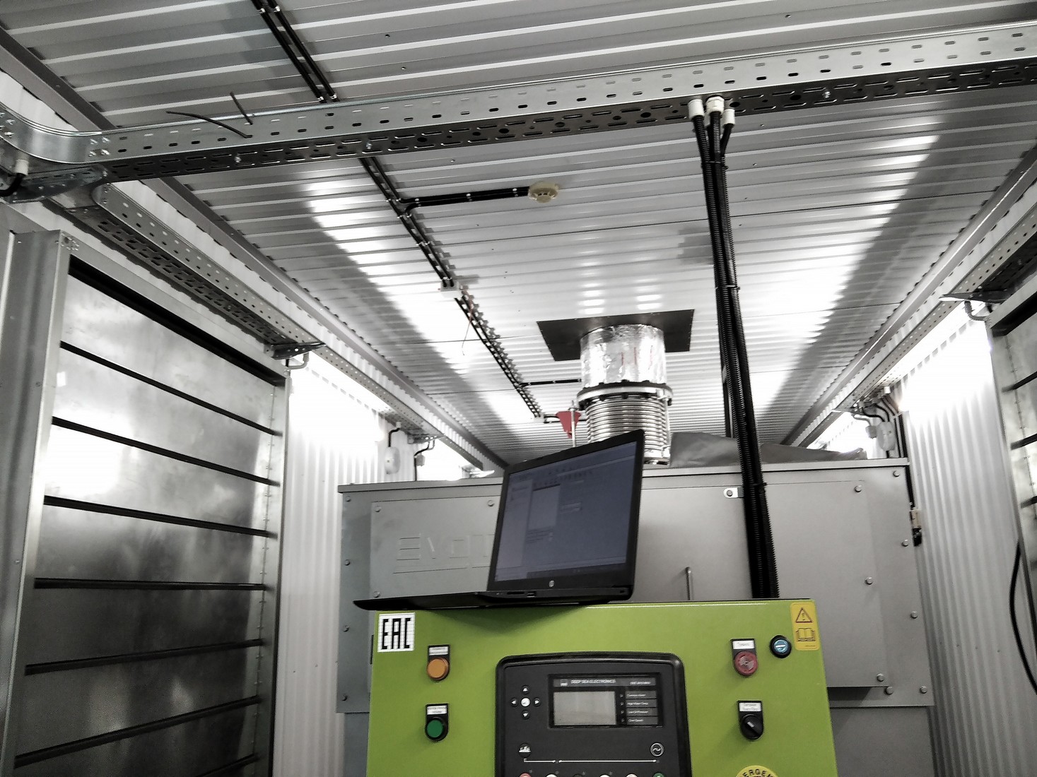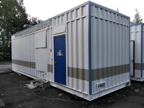 BACG functioning: The power supply of the container’s auxiliaries boards is carried out from the external network. Emergency lighting and sockets are powered by genset batteries. At low weather temperatures, the heating system automatically maintains the temperature in the BACG set by the thermostats. When the temperature inside the container reaches about +25°C (determined by the thermostat setting), the exhaust valve opens. Ventilation in the container is carried out using unified air-intake valves. When the genset starts, the control signal is given to the supply unified air intake valve drive, which opens immediately upon starting the genset. In this case, all ventilation hatches should be open. The genset also stops automatically if the air temperature in the container is more than 50 C. Fire extinguishing and security alarm systems have their own battery and are in standby mode. In the event of a fire, unified air-intake valves are de-energized and spring-return electric drives close them. At the same time, a command is given to stop the genset (if it is working). The fire extinguishing system is triggered. |