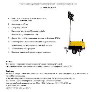 In March 2022, Techexpo delivered a 160 kW DG and two hydraulically operated light posts for the Yakovlevsky ore mining and processing enterprise. Yakovlevsky ore mining and processing enterprise managed by Severstal company carries out mining and processing of iron ore. The plant is located in the village of Yakovlevo, Belgorod region. 160 kW HERTZ HG220DC enclosed-type genset is manufactured in a protective case based on a Doosan DP086LA engine (Korea). The DG is used as a backup power source for hoisting equipment at a mine of the ore mining and processing enterprise. Two ТE.350-6.0М-5,5GX hydraulically operated lights are necessary for lighting mining facilities and the construction camp of the Yakovlevsky ore mining and processing enterprise. Mobile lighting set TE.350-6.0M-5.5GX in a protective casing