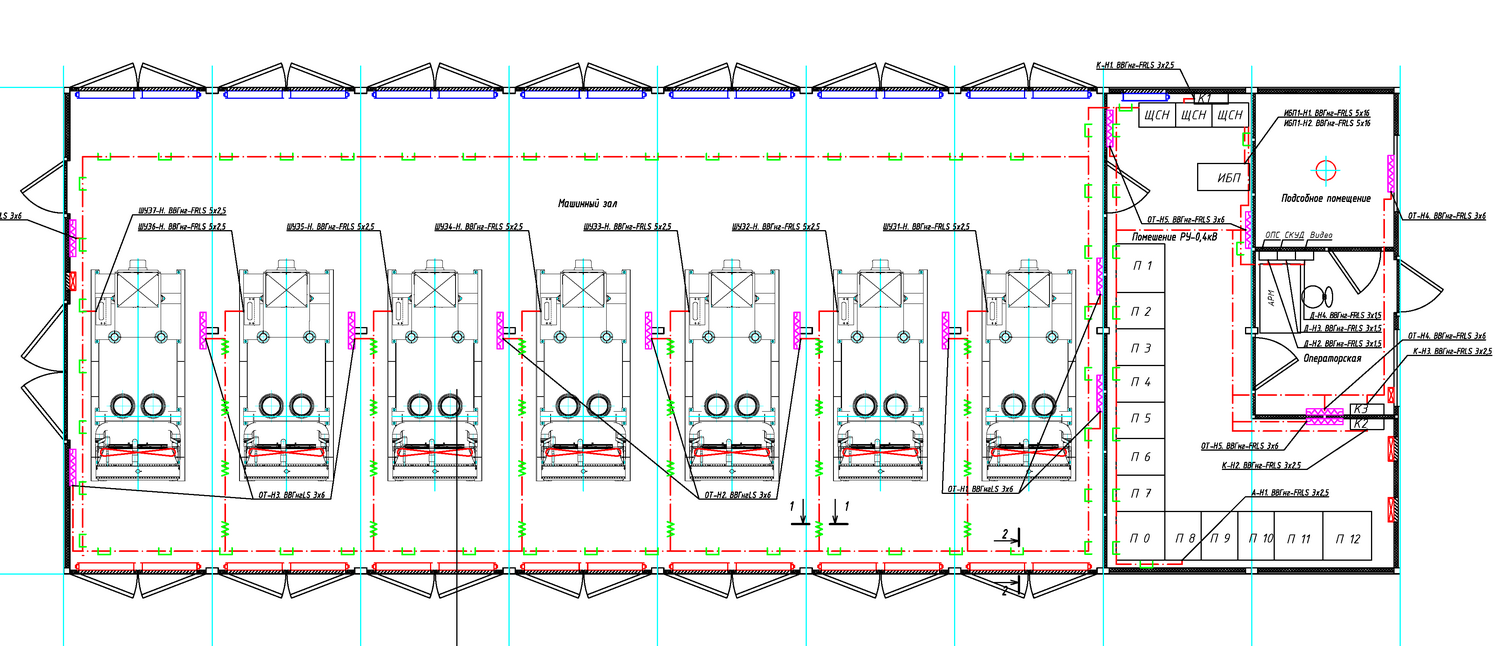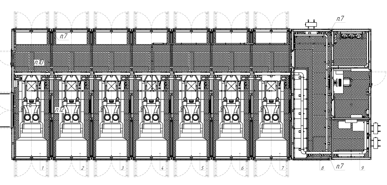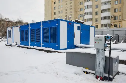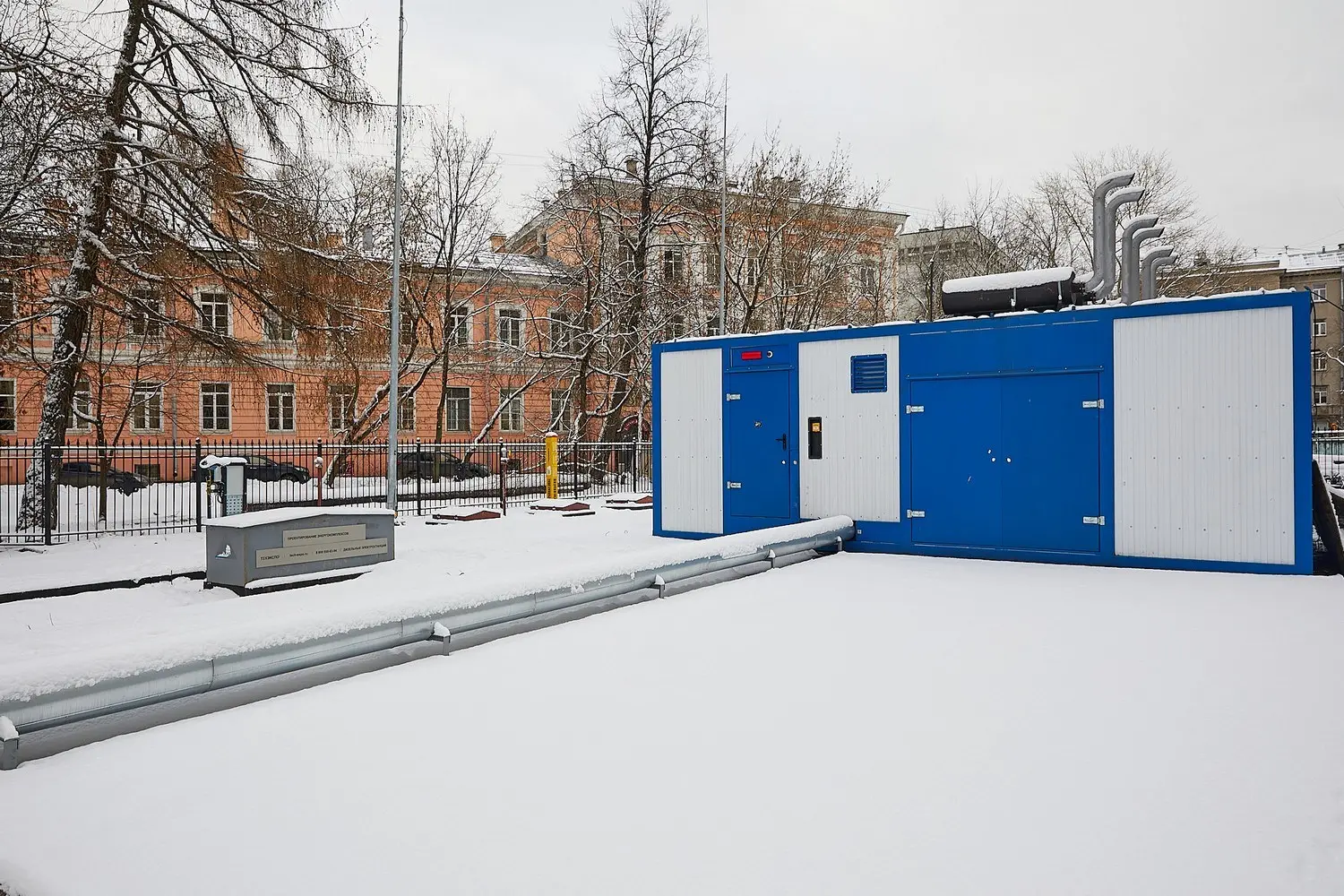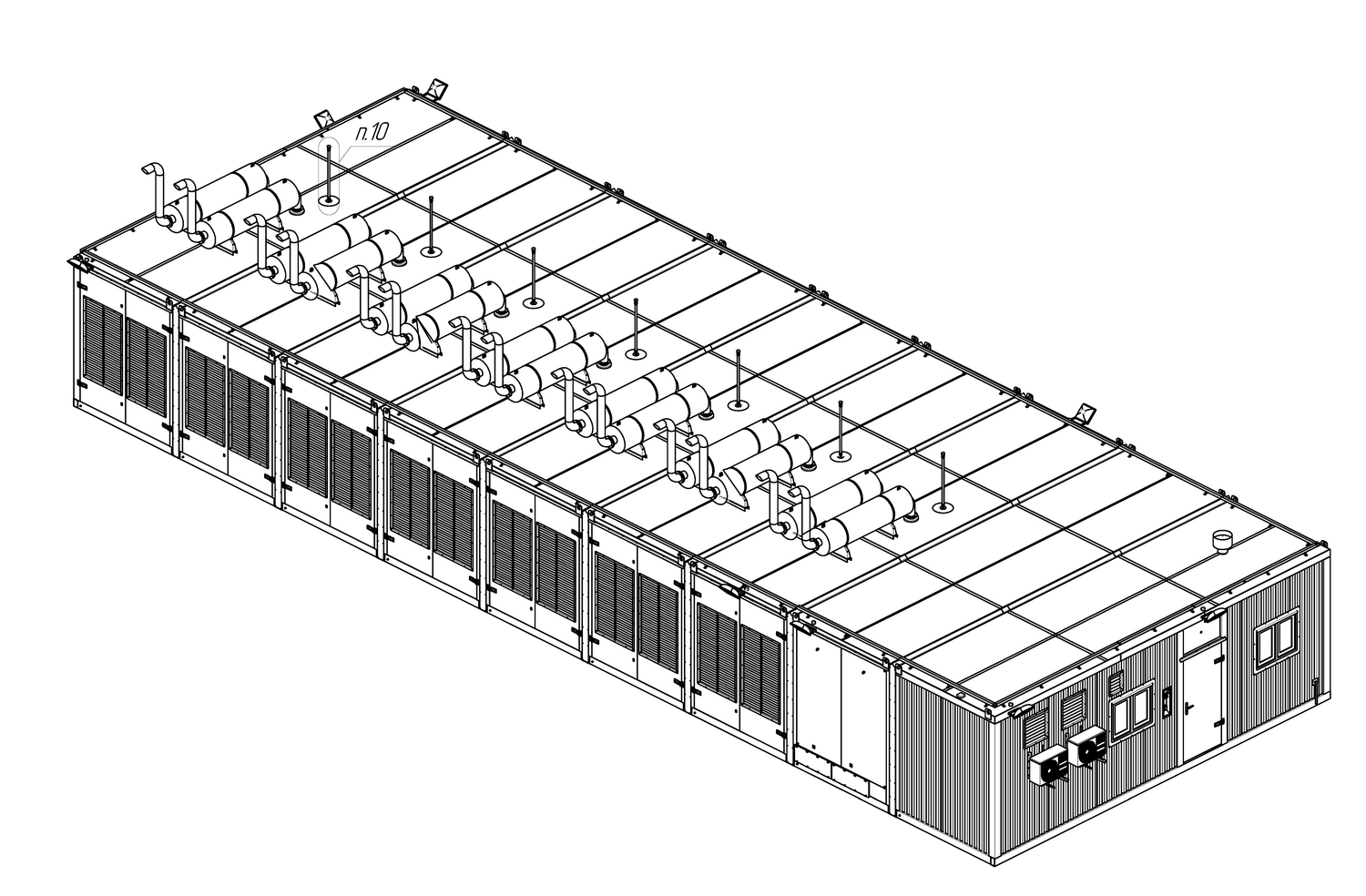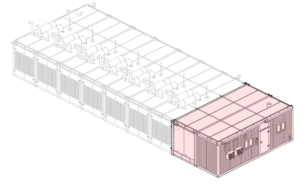 The second module is an operator's room for control and management of the power supply package and a utility room. Two modules with dimensions of 8000x2400x3000 mm are hermetically connected. The strength of the structure is additionally reinforced by the rigidity of the corrugated sheets of the outer skin, roof and floor. Insulation - mineral wool 100 mm thick. The block module provides window and door openings, ventilation and vapor barrier system. A gas fire extinguishing system is installed. In the design of containers, a raised floor is installed with cable routing to connect the DG to the switchgear. The finished module is installed on a concrete foundation and connected to the container units of the diesel gensets.