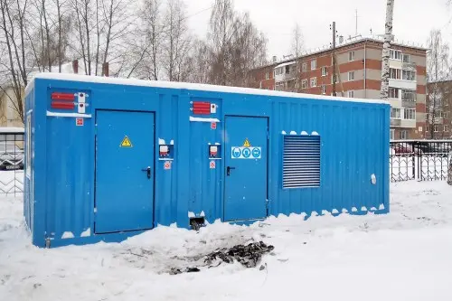 The container is fitted with cooling and ventilation systems, a lighting system, an exhaust emission system, a fire alarm and an automatic fire suppression system. Equipment includes an auxiliaries board and a metal cable tray for laying the cable lines of internal utility systems. A monitoring cabinet for discreet signal output (unauthorized access, failure, fire) from the fire alarm system and genset controller (for remote monitoring and genset control) is located in the operator’s area. The container is additionally fitted with two 1500 W electrical convectors maintaining the air temperature in the container compartments within 15-25°С in winter. The genset fuel system consists of a diesel genset fuel system (350-liter inbuilt fuel tank) and an additional 500-liter fuel tank with an automatic fuel feed system. Construction and installation works: The container is mounted on a foundation made from reinforced concrete plates. According to the project documentation, earthwork operations for making the diesel genset foundation were carried out, including the installation of reinforced concrete plates and fixing them. The diesel generator unit is designed to supply several medical facility consumers with standby power: maternity #2 and an in-patient facility unit of City Clinical Hospital #4 of the Ministry of Health of the Udmurt Republic Budgetary Healthcare Facility. The following works were performed to connect the diesel genset to the consumers: