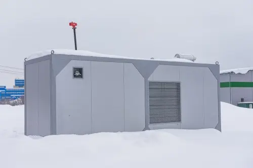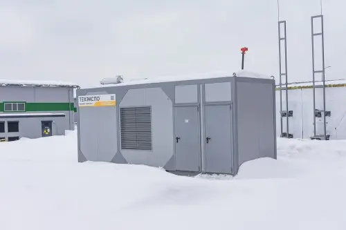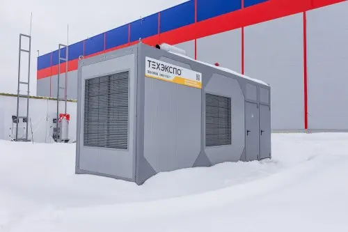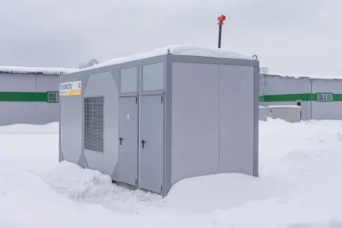 The TE.600S-T400-2RN diesel generator set manufactured by Techexpo with a rated power of 600 kW was chosen as a backup power source: fuel consumption at 75% load is 148 liters/h. The DGS was delivered in a lightweight container made of sandwich panels with 50 mm insulation, which made it possible to reduce the cost of delivery, but nevertheless protect the equipment from negative environmental factors.